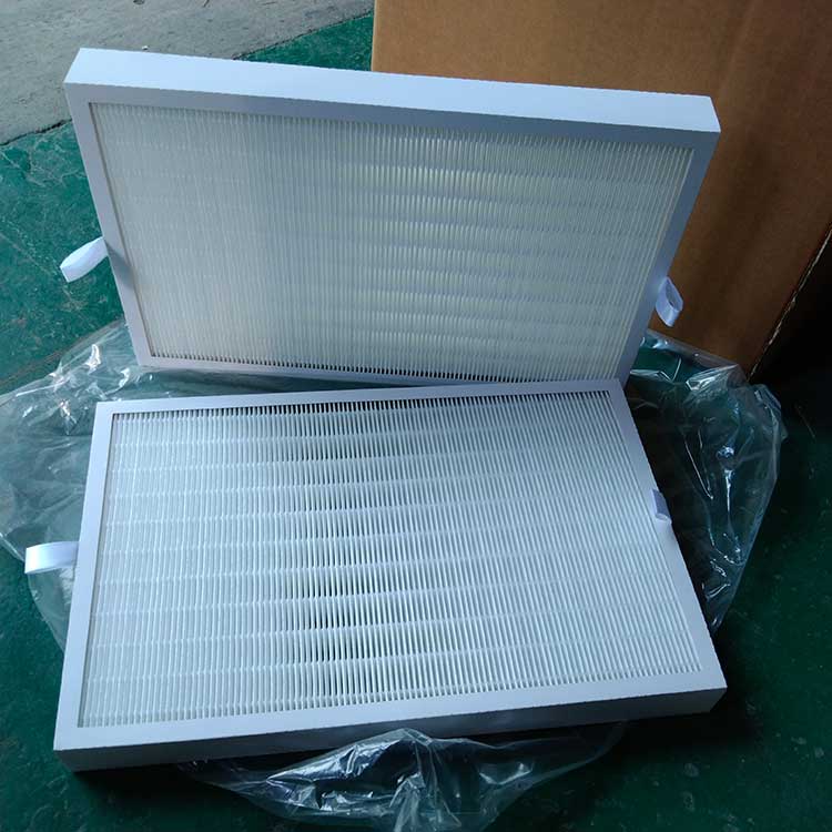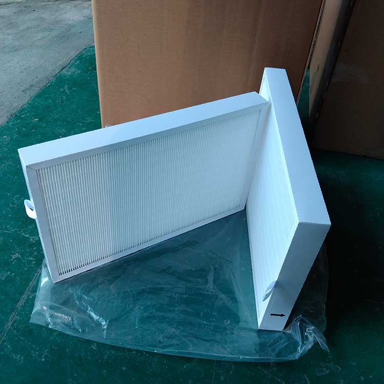 過濾材料是以折疊形式裝入高強度模切硬紙板內(nèi),迎風(fēng)面積增大。流入的空氣中的塵埃粒子被過濾材料有效阻擋在褶與褶之間。潔凈空氣從另一面均勻流出,因此氣流通過過濾器是平緩和均勻的。視過濾材料不同,它所阻擋的粒徑從0.5μm到5μm而不同,過濾效率也不同 。
